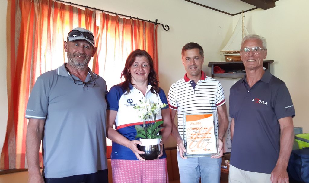 ich bedanke mich sehr herzlich für eure Überraschung anlässlich meiner 25 jährigen „Sekretärschaft“ der Aquila in Seeham. Ich muss ehrlich sein, ich habe nicht mitgezählt, wie viele Jahre ich nun Klassensekretär sein durfte, dass es nun bereits 25 Jahre sind, hat mich sogar ein wenig geschreckt. Andererseits sind von damals nicht nur du, sondern auch noch einige weitere Seglerkollegen immer wieder bei unserer Regatten dabei, was mich sehr freut. Natürlich freuen wir uns auch alle, dass sich immer wieder neue Teams zu uns gesellen, um unsere gemeinsame Leidenschaft, das Segeln auf unsere Aquila mit einer Brise Wettkampf kombiniert, zu genießen.