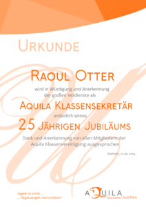 Raoul wurde bei der JHV am 24. Sept. 1994 als Nachfolger unseres Herbert Wiesholzer zum Klassensekretär der Aquila-Klasse/Österreich gewählt. Er zierte sich ein wenig, aber sein Vater Josef hatte unser sanftes Drängen erfolgreich unterstützt – Gott sei Dank! (Seit 1993 war Raoul ja schon Schriftführer);